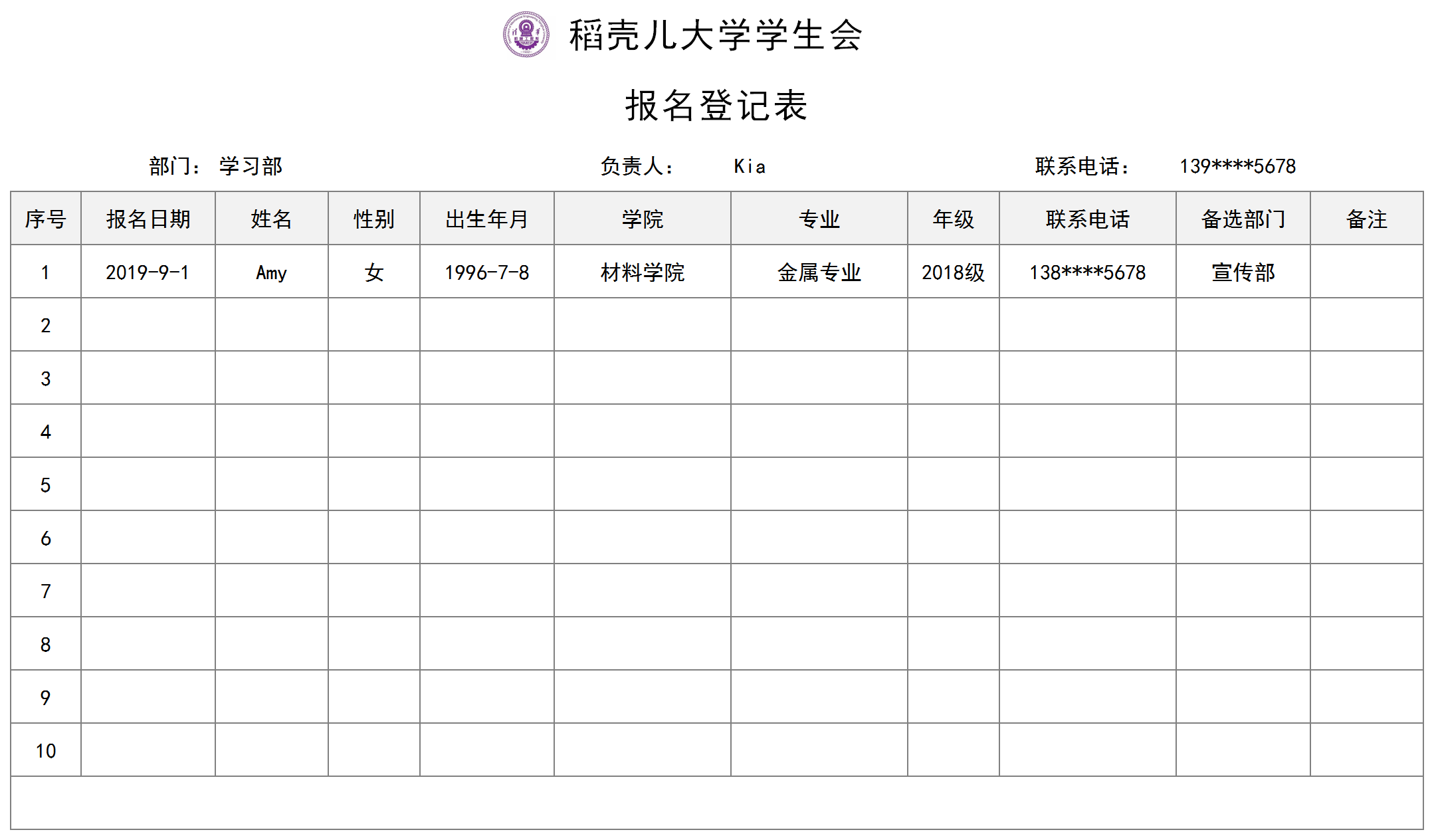 excel模板-社团报名登记表