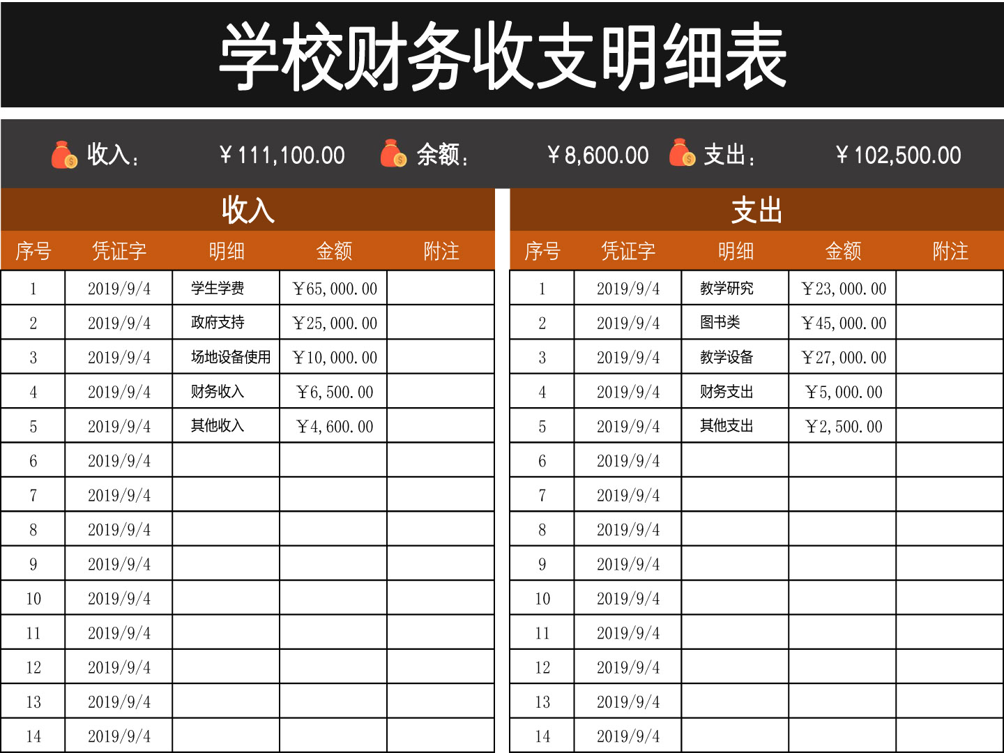 excel模板-学校财务收支明细表