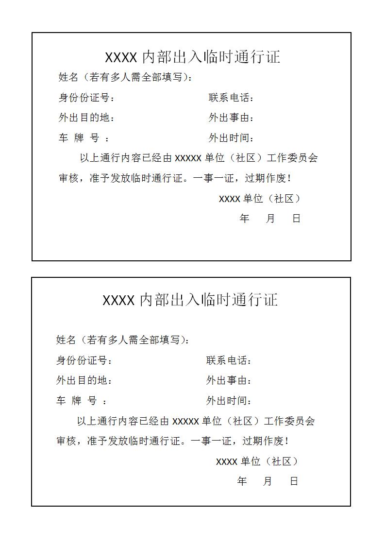 word模板-单位社区内部出入临时通行证