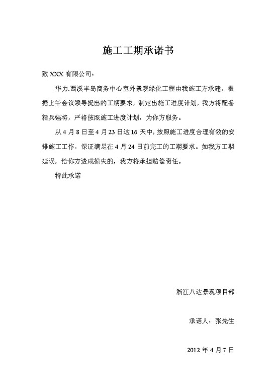 word模板-施工工期承诺书