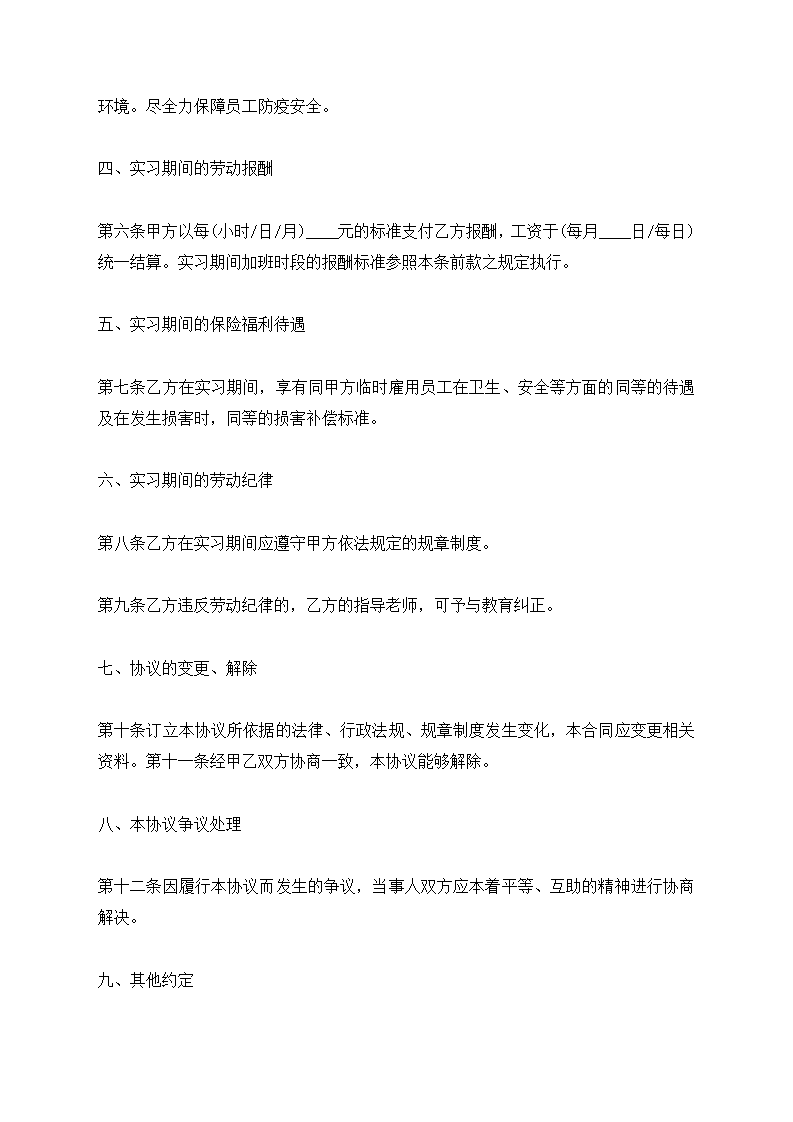 word模板-疫情期间大学生顶岗实习协议书