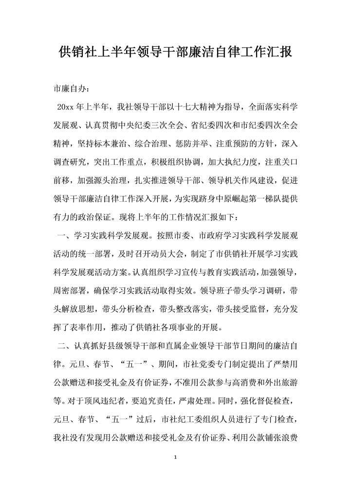 word模板-供销社年上半年领导干部廉洁自律工作汇报