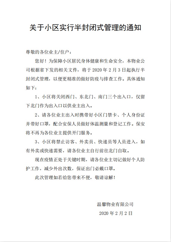 word模板-关于小区实行半封闭式管理的通知