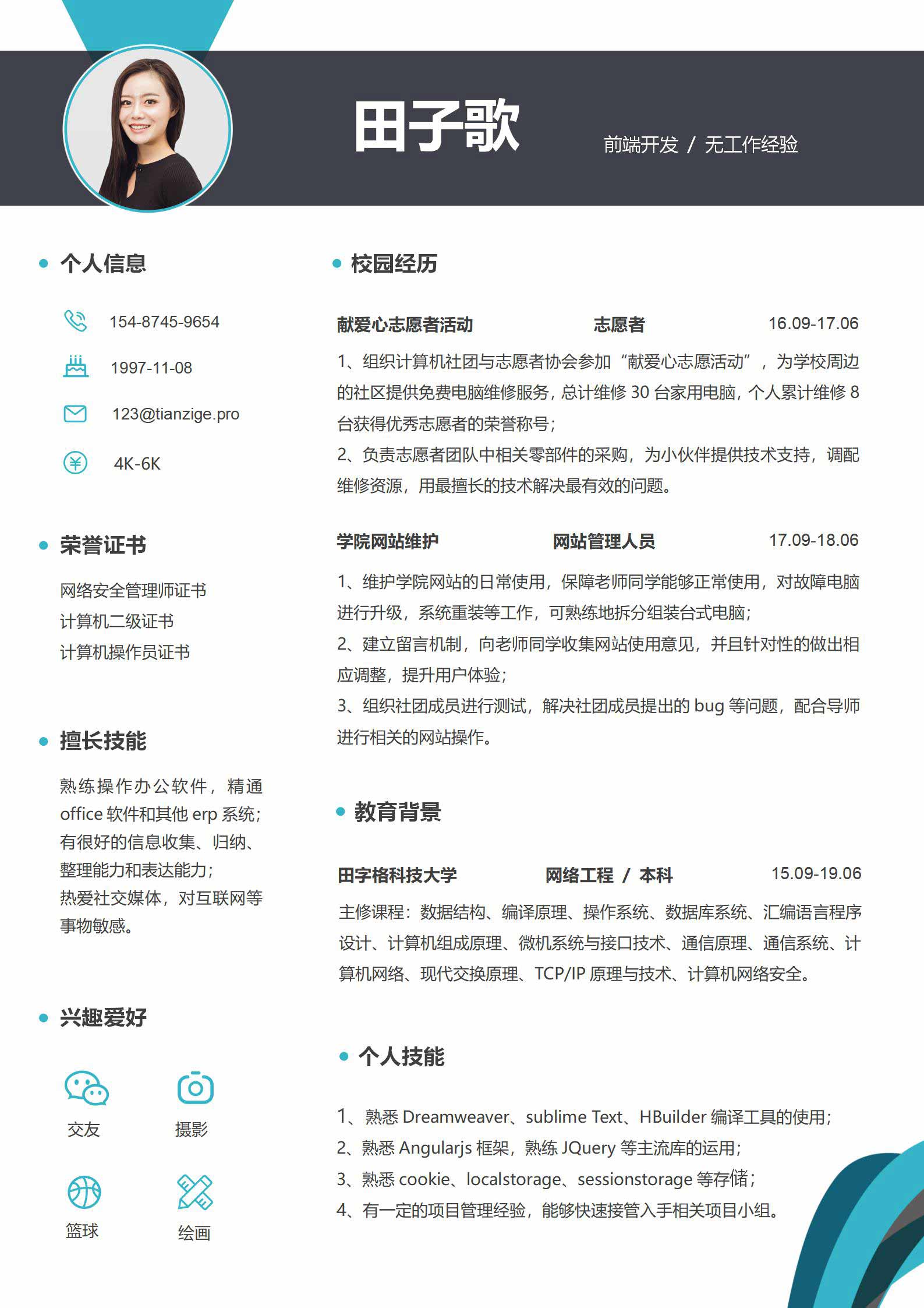word模板-蓝色商务前端开发无经验春招简历
